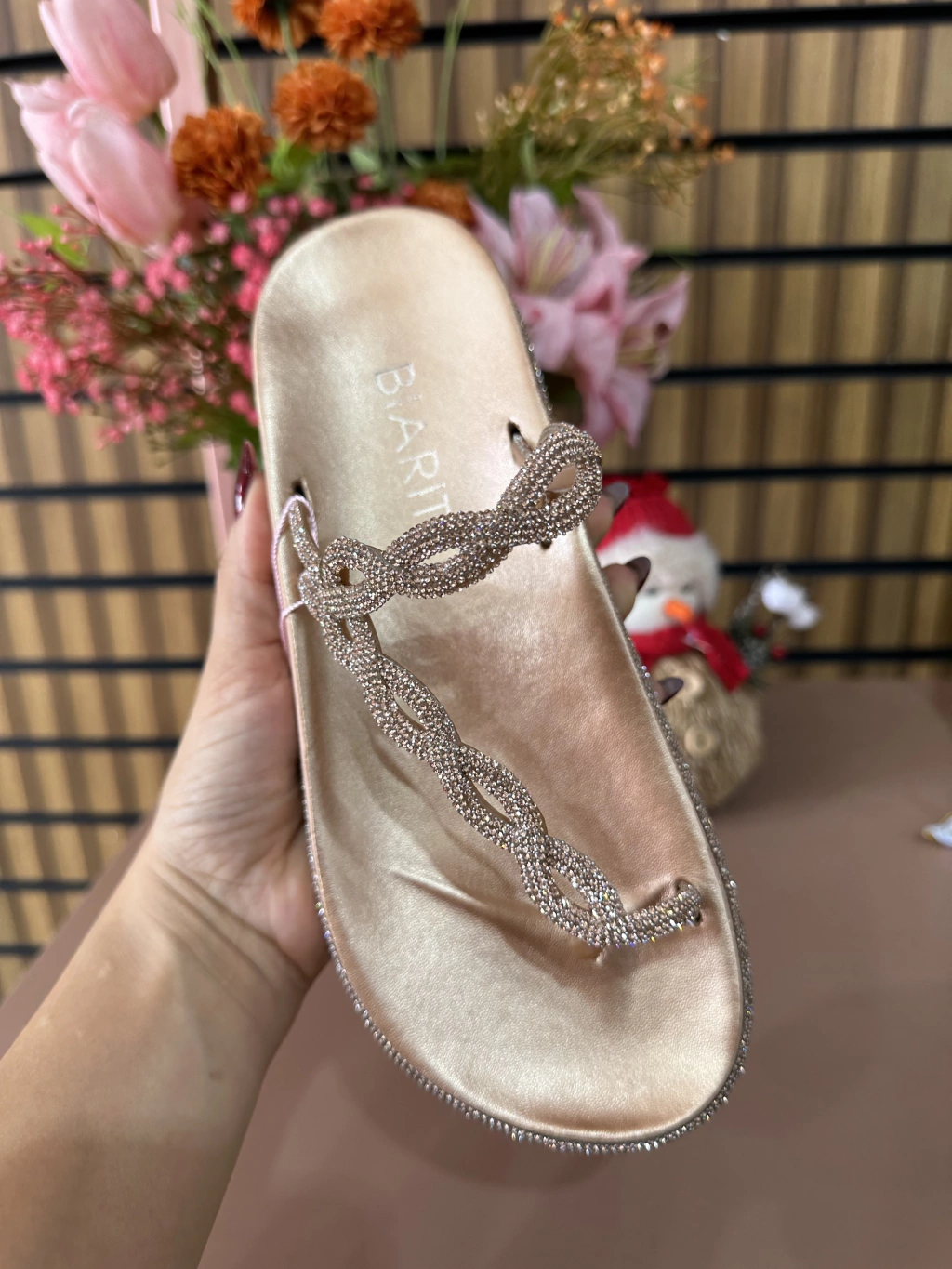 As pedrarias na base e nas tiras trazem um efeito luminoso discreto e elegante — ideal pra quem ama detalhes que fazem toda diferença.