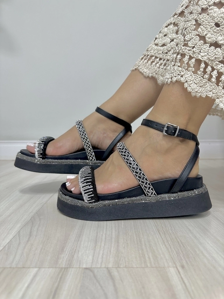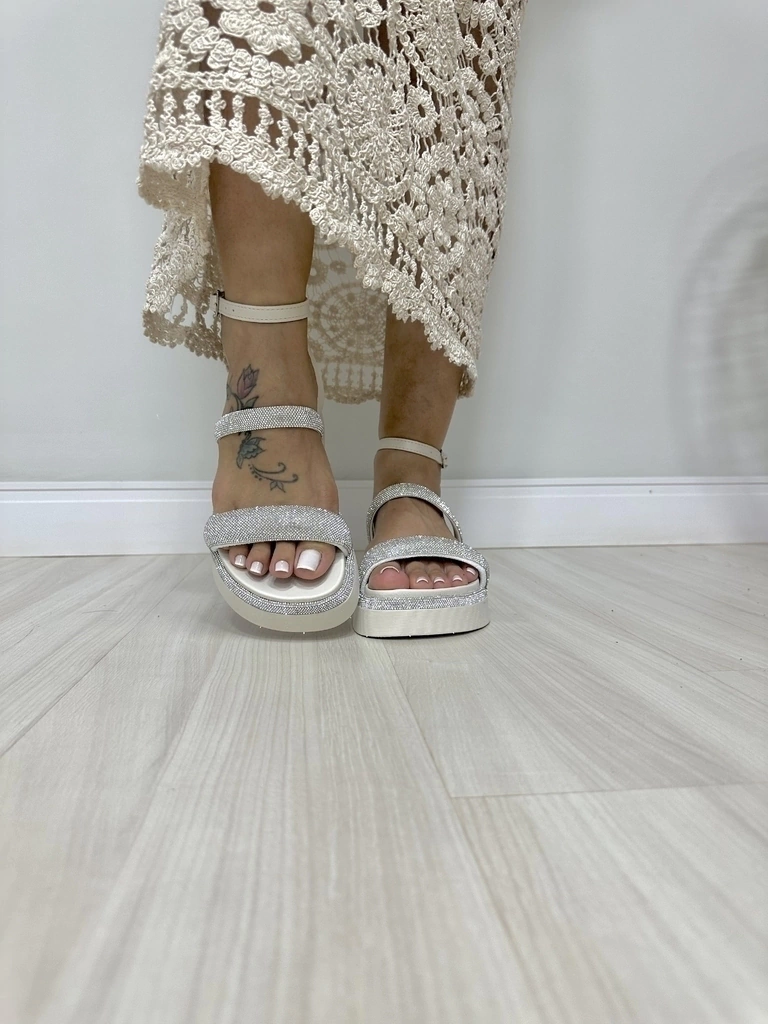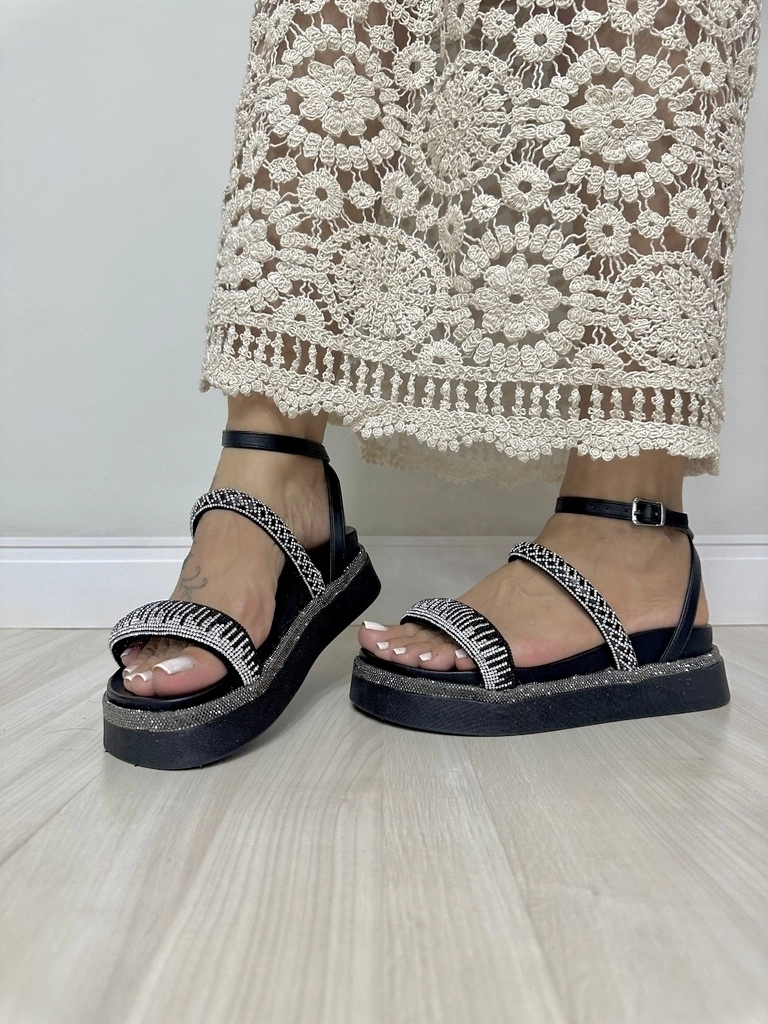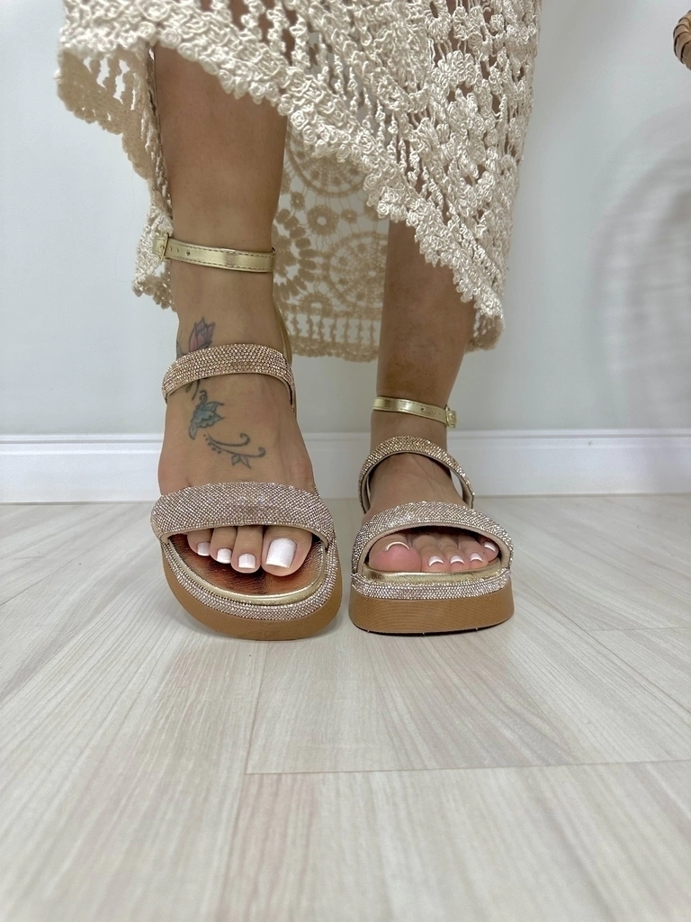 Com tiras delicadamente cravejadas e acabamento metalizado, ela traz o brilho certo para elevar qualquer produção — do dia a dia aos momentos especiais. ✨
