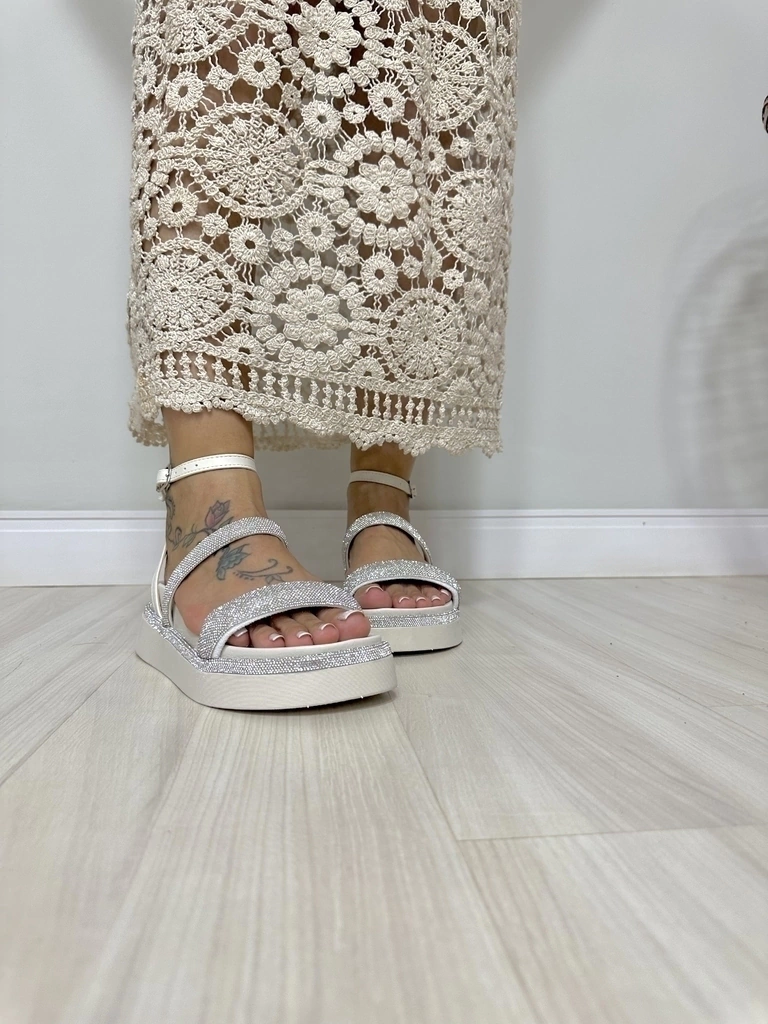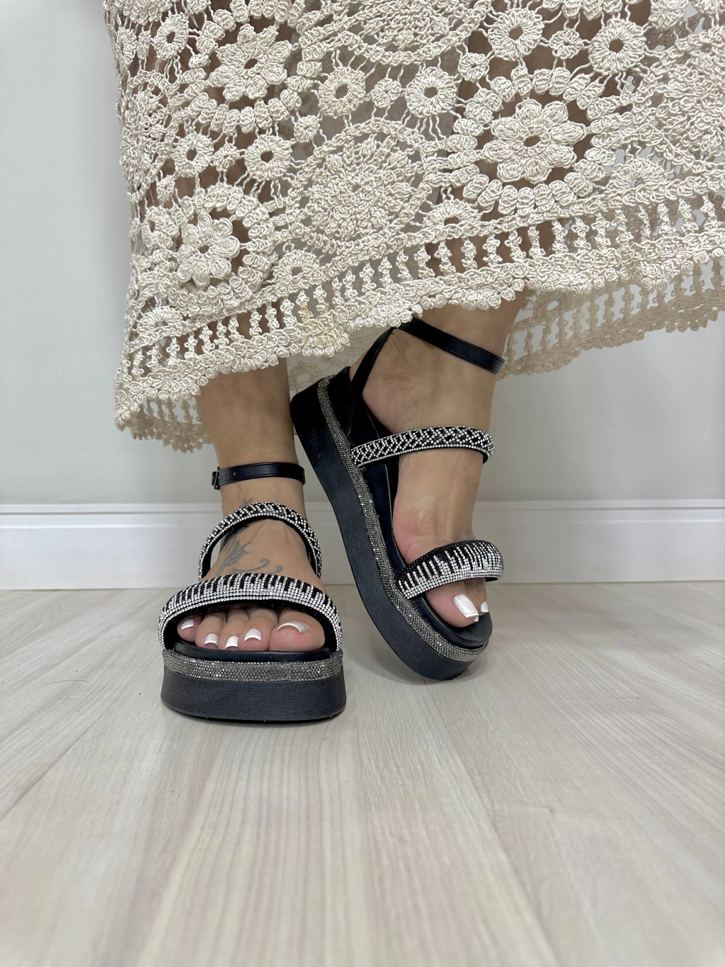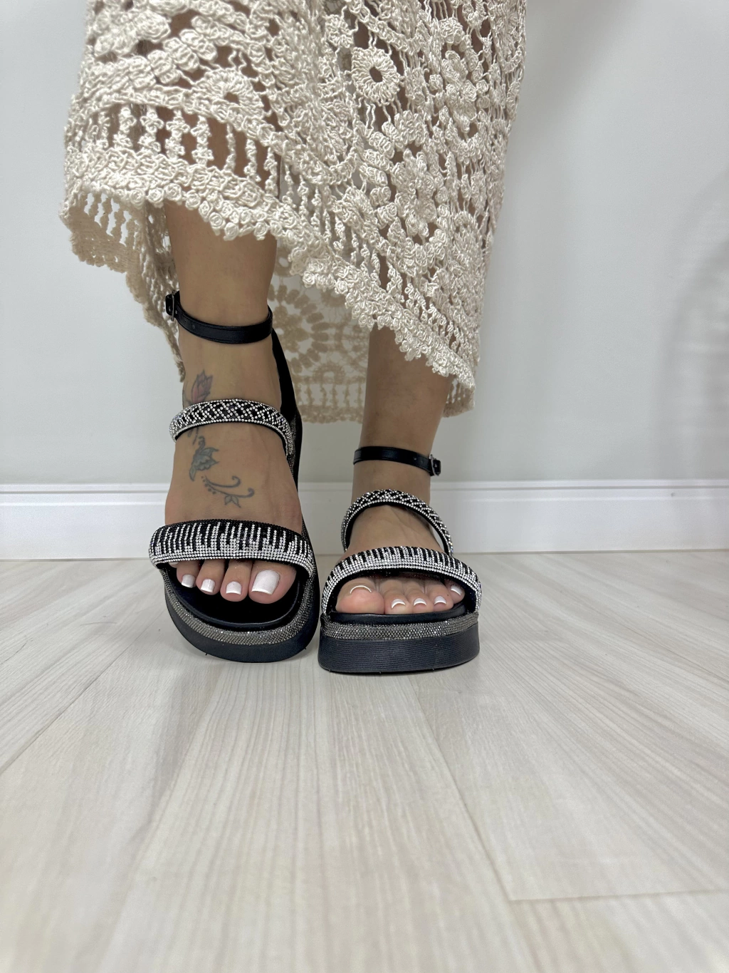 Com tiras delicadamente cravejadas e acabamento metalizado, ela traz o brilho certo para elevar qualquer produção — do dia a dia aos momentos especiais. ✨