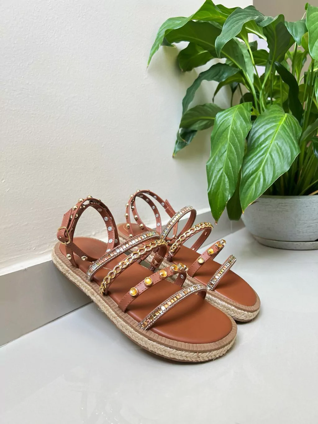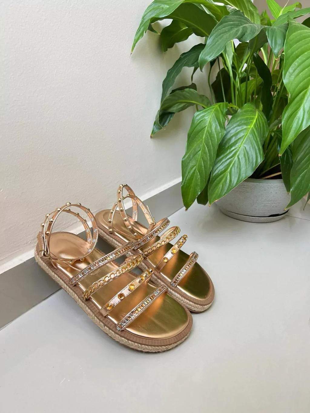 A combinação de pedrarias e detalhes dourados deixa o modelo sofisticado, mas ainda super versátil pro dia a dia.