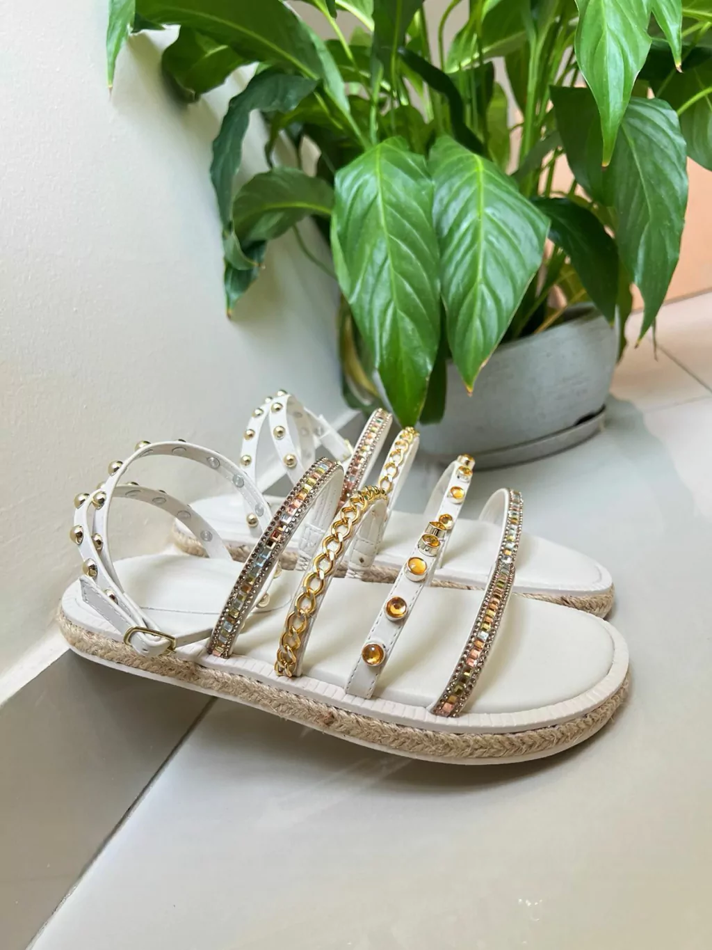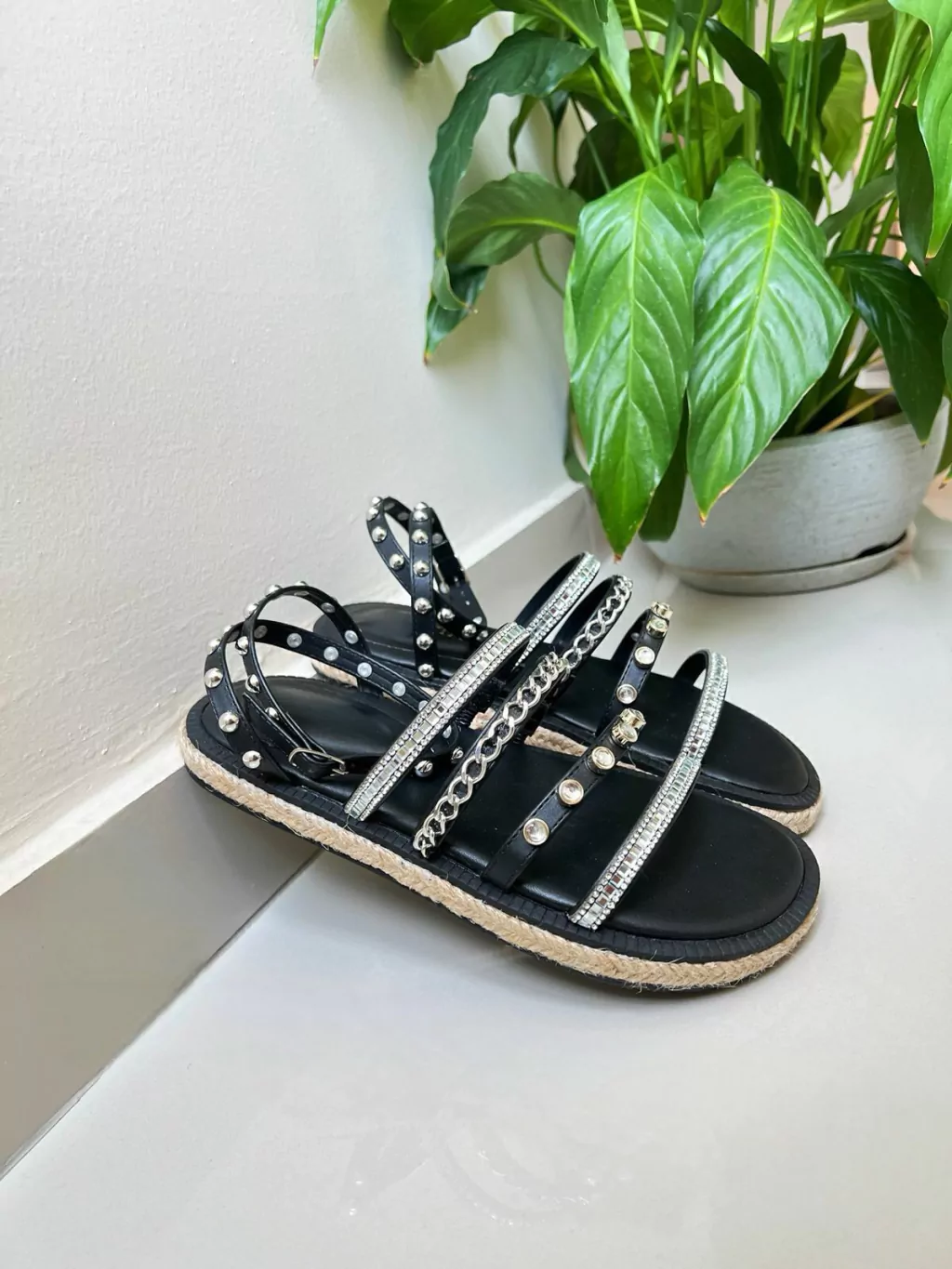 Detalhe: Tiras cravejadas com mix de texturas e brilho