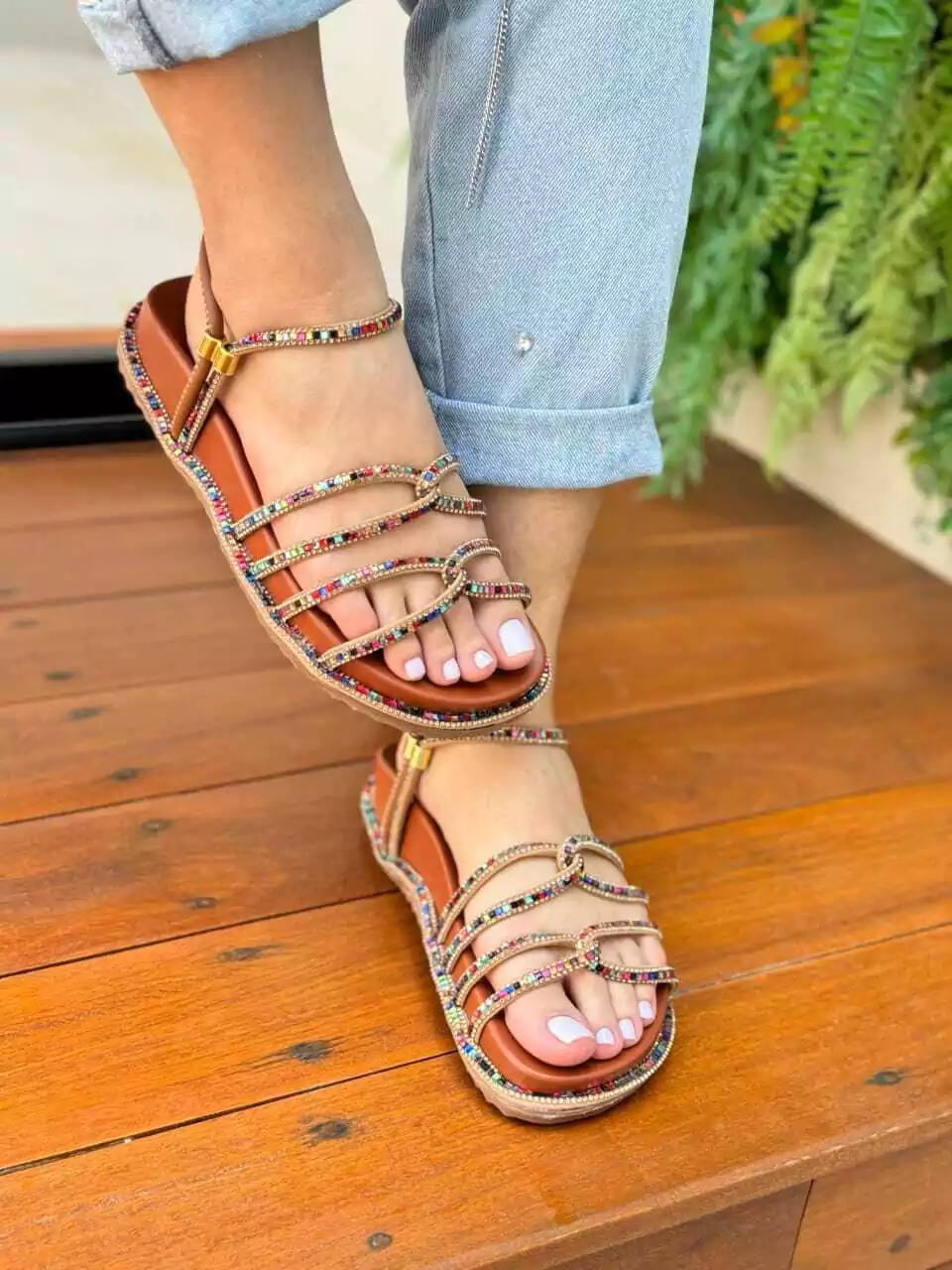 As pedrinhas coloridas trazem um charme alegre e sofisticado, destacando os pés e deixando o look cheio de personalidade.